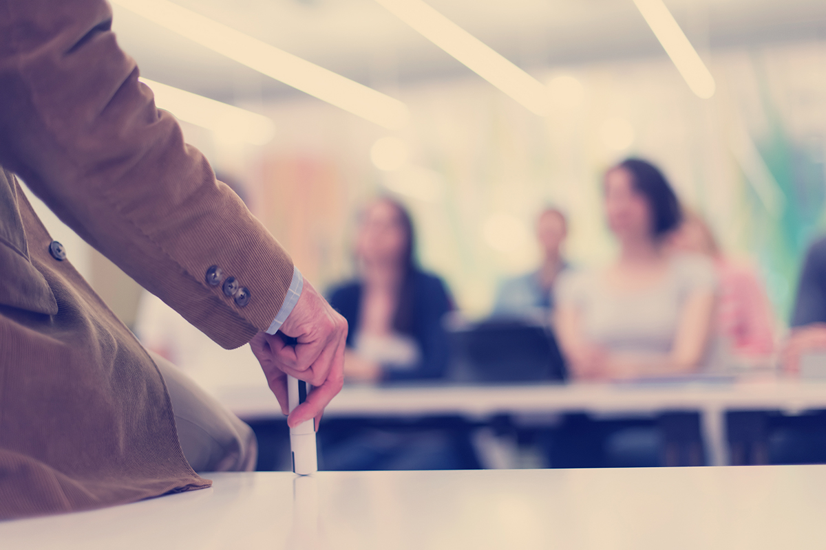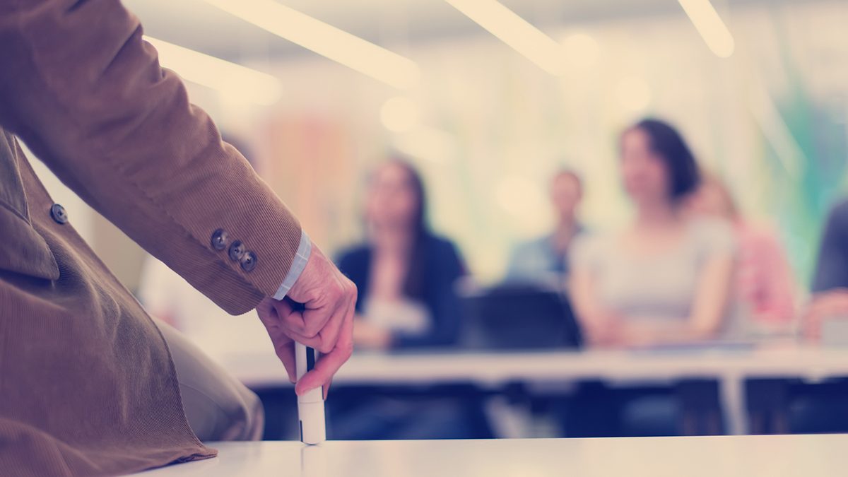 close up of teacher hand with marker while teaching lessons in school classroom to students